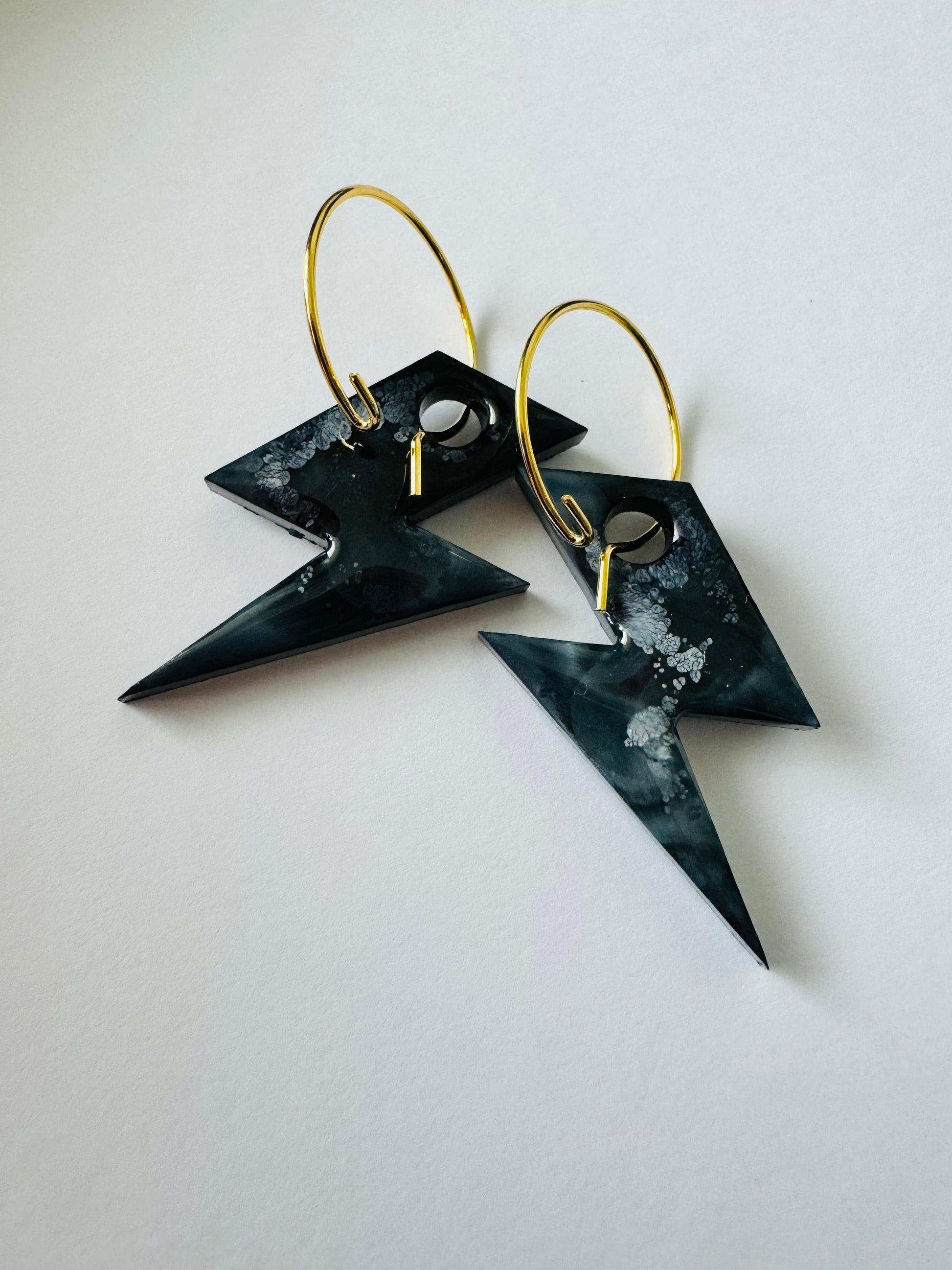 Black & White Lightning Bolts - Resin Hoop Charm Earrings