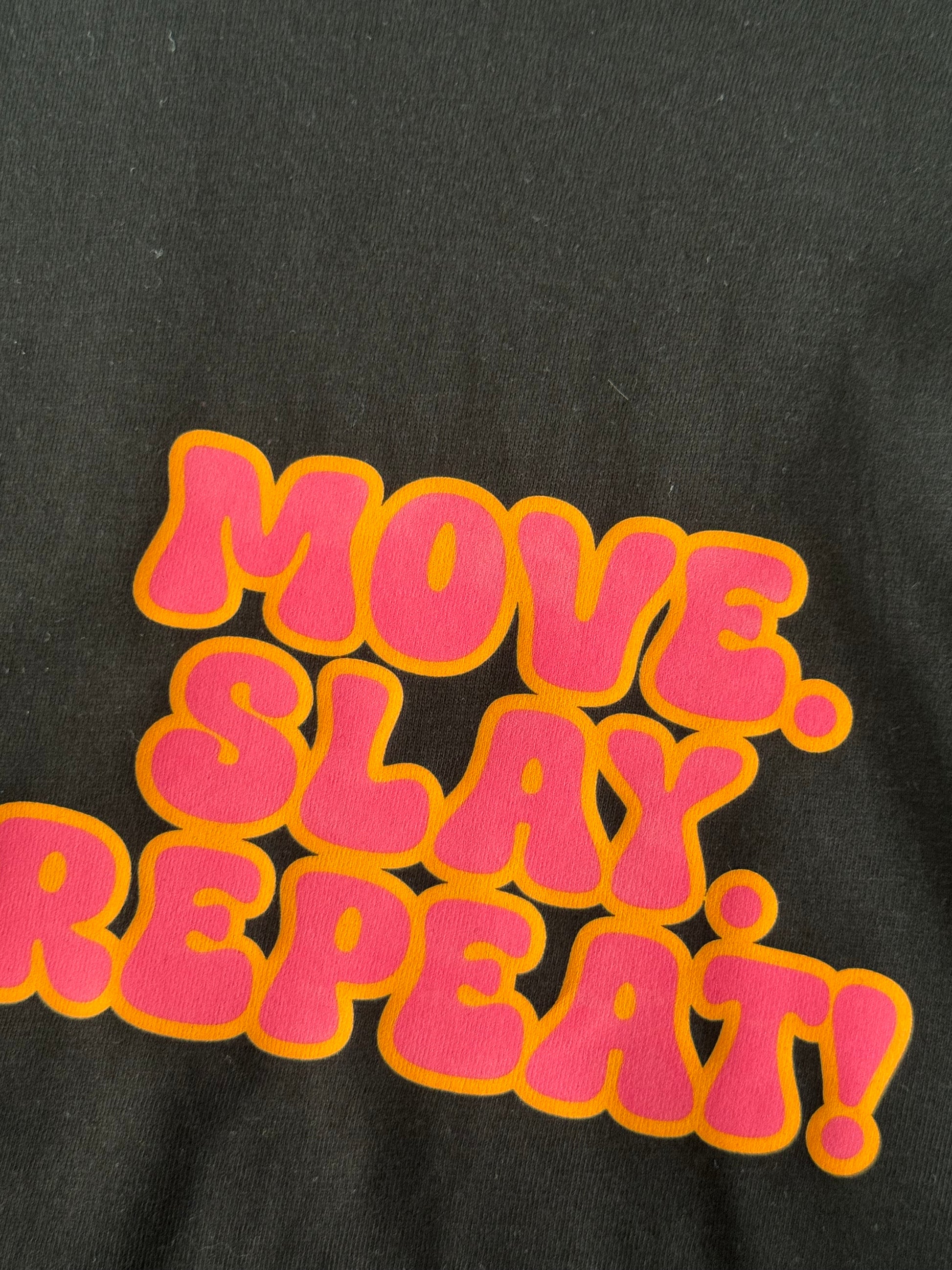 ✨ Retro ‘MOVE. SLAY. REPEAT!’ slogan in hot pink + orange