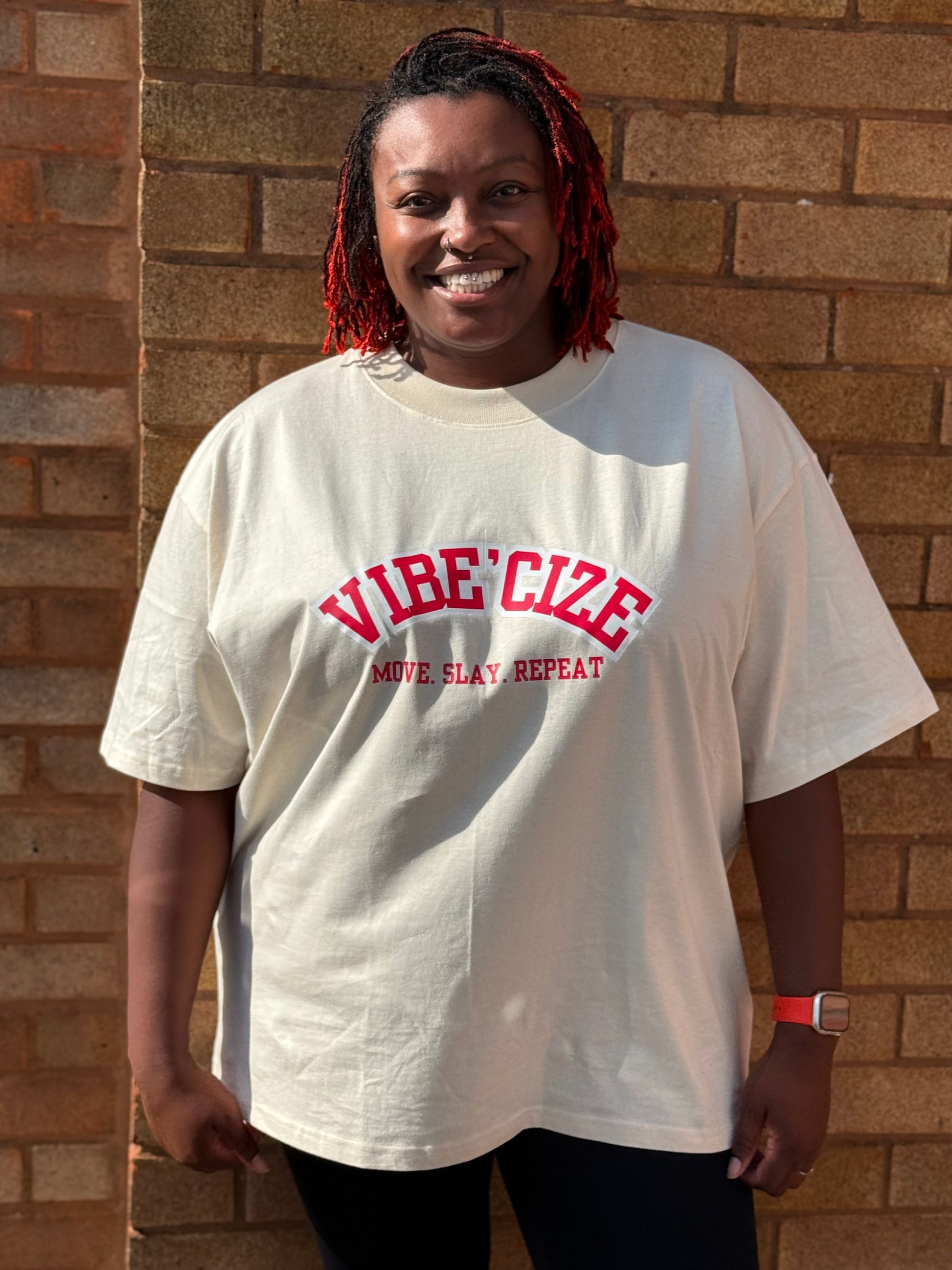The Vibe’Cize: Move. Slay. Repeat Oversized T-Shirt is more than a top: it’s a whole vibe. Designed with dancers, movers, and slay queens in mind, this comfy varsity-style tee brings maximum confidence and effortless style to every routine (and rest day).